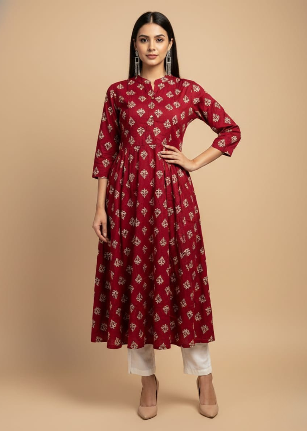 Flowy A-Line Pure Cotton Dark Red Umbrella Kurti