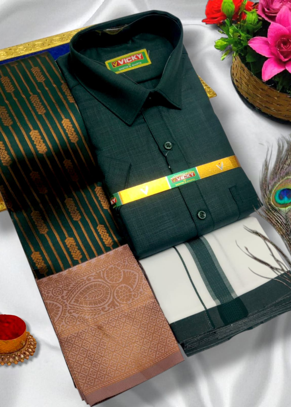 Premium Light green Wedding Silk Saree with Veshti & Shirt Combo Set