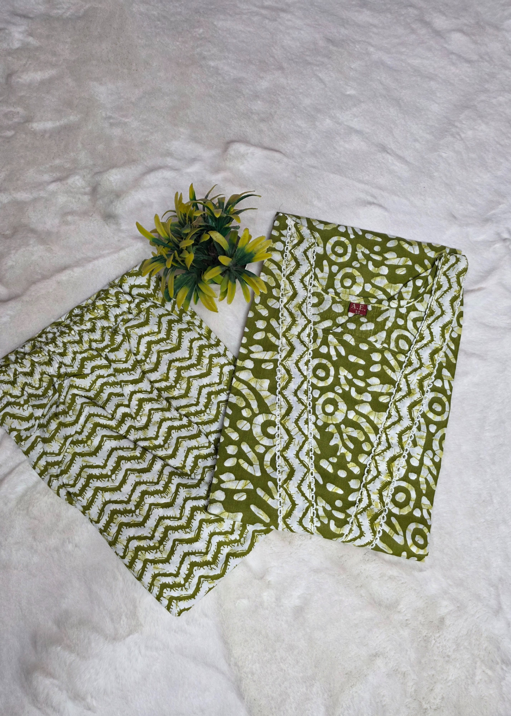 Daily Wear Cotton Leaf green Kurti with Matching Pant