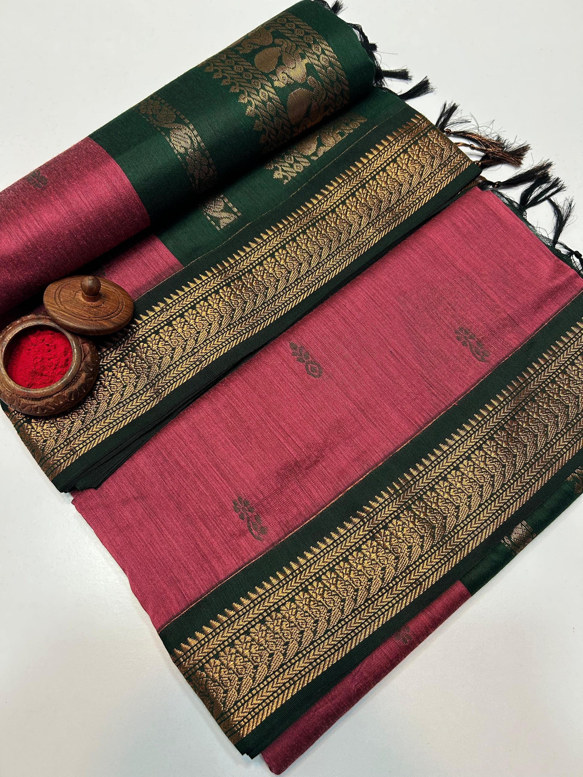 Crafted from breathable and lightweight Kalyani cotton, this saree is ideal for long hours of wear — from formal occasions and family gatherings to temple visits or office celebrations.