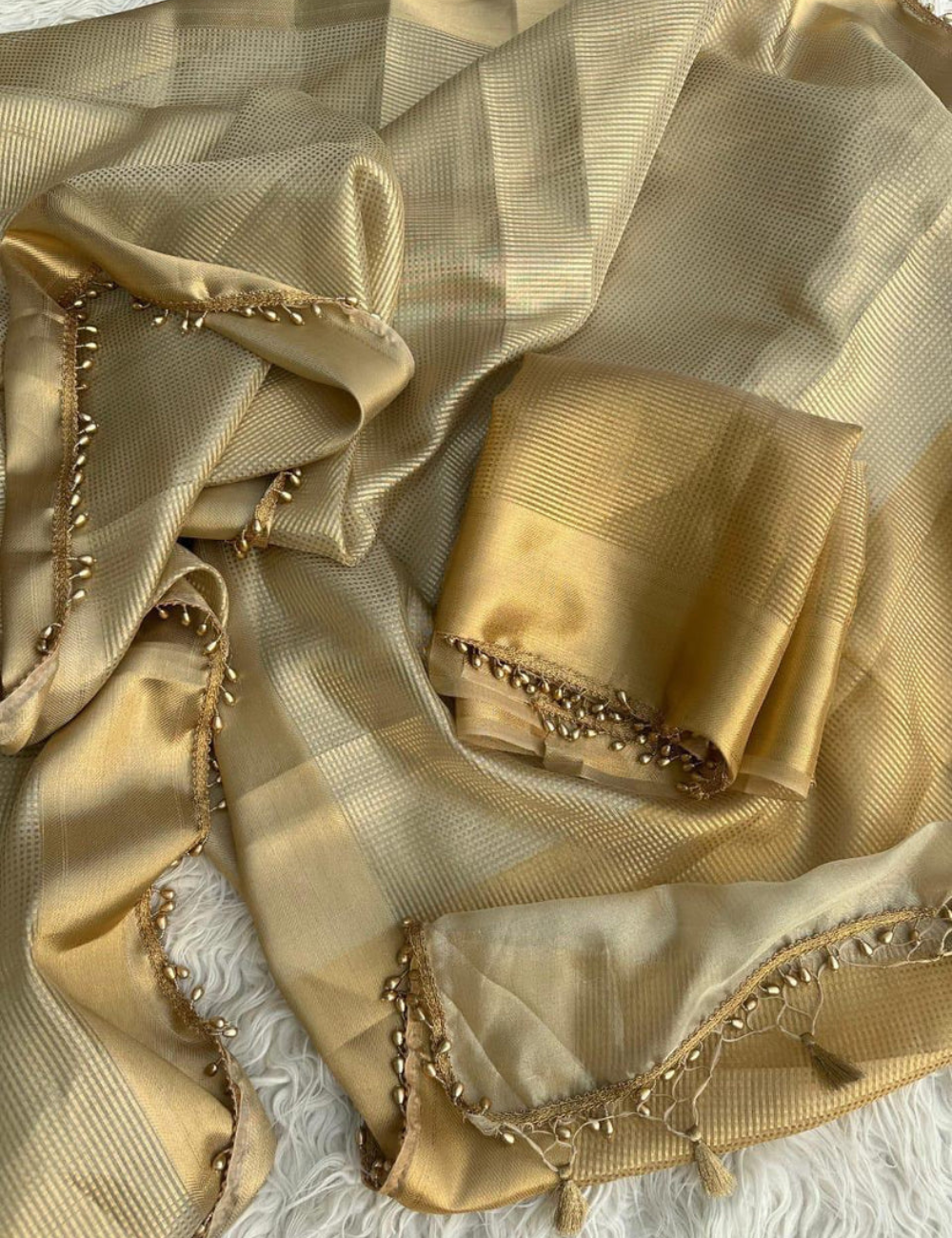 "Nayantara inspired Gold Banarasi Tissue Silk Saree with Lace"